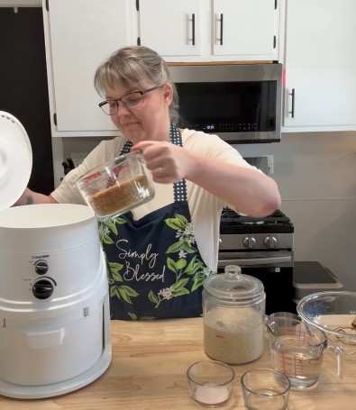 - Pour your wheat berries into the hopper.